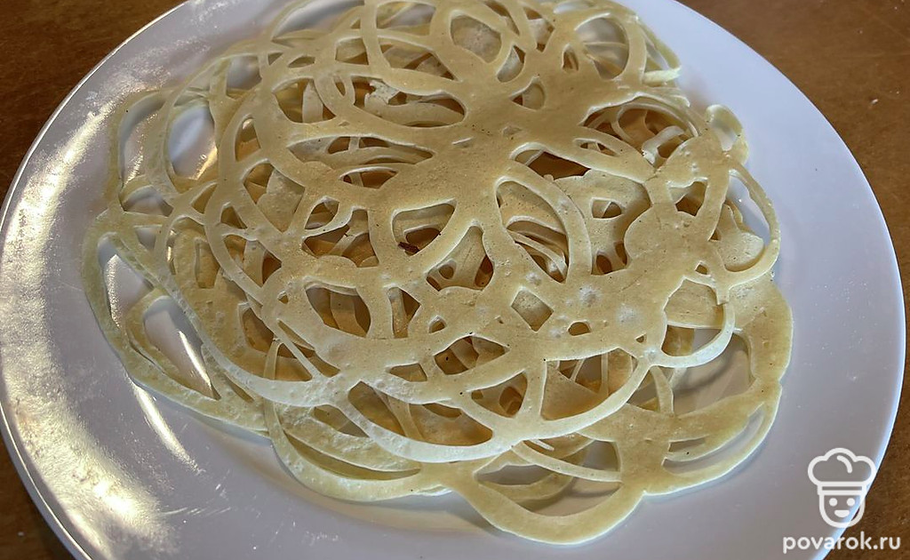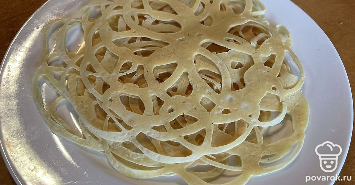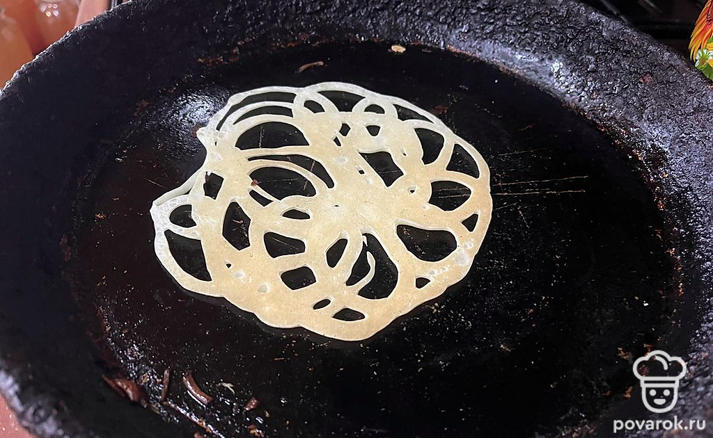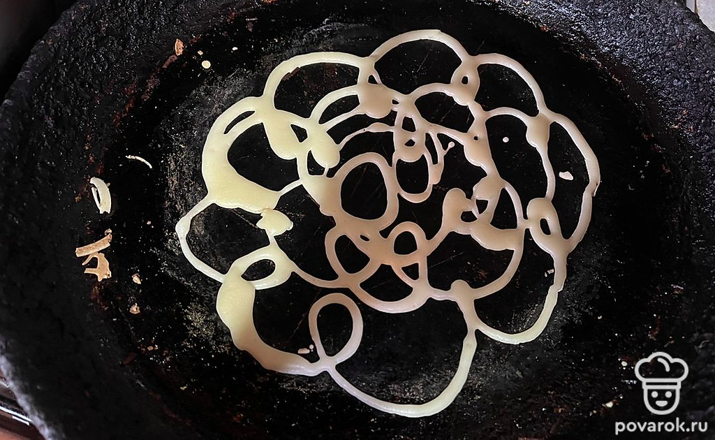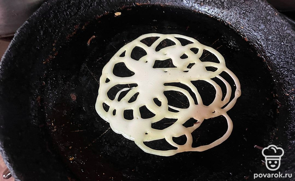 Сковороду смажьте сливочным маслом, поставьте ее на медленный огонь. На разогретую сковороду хаотично вылейте тесто.