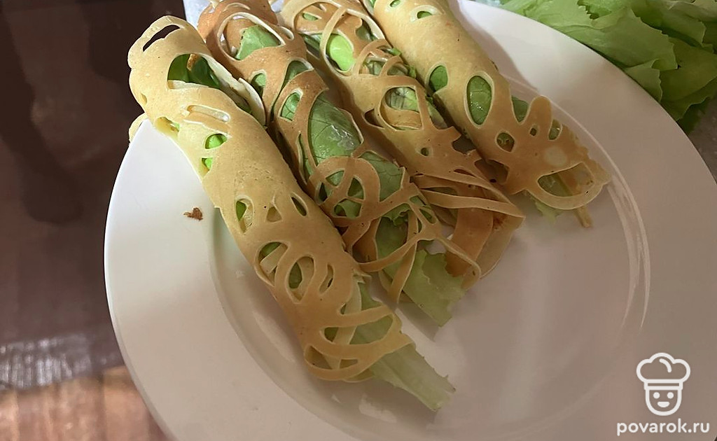 В готовые блинчики можно завернуть абсолютно любую начинку (листья салата, слабосоленую форель и другие).