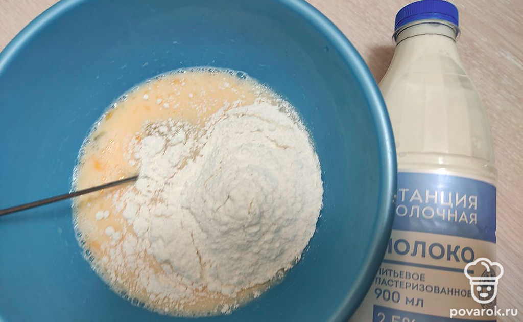 Яйца с молоком, сахаром и солью смешайте до однородности.