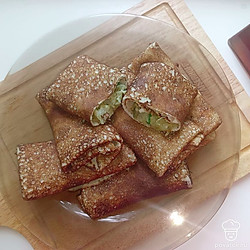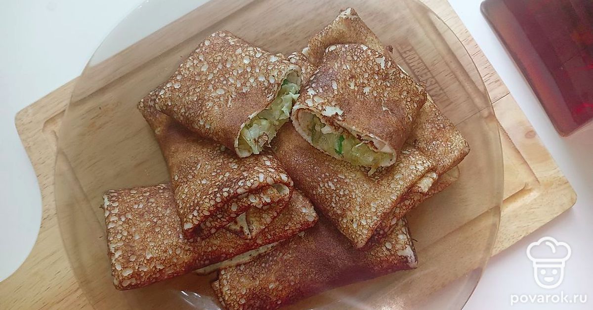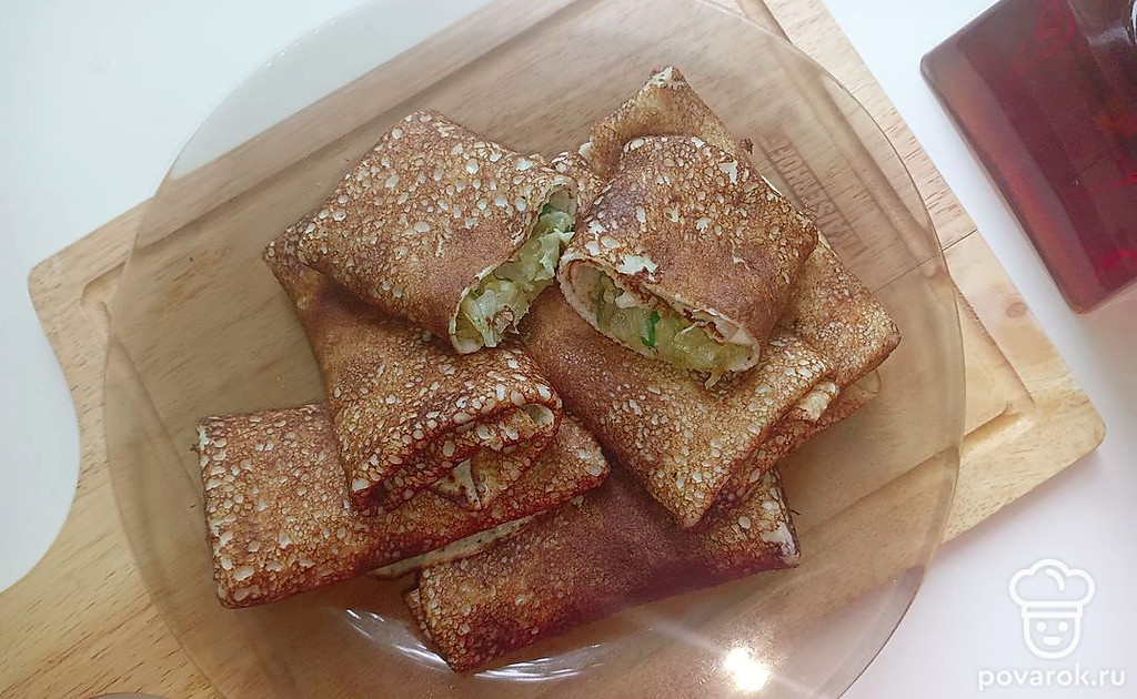 На светлую сторону расправленного блина выложите 1 ложку начинки, заверните по краям и сверните в плоский рулетик.