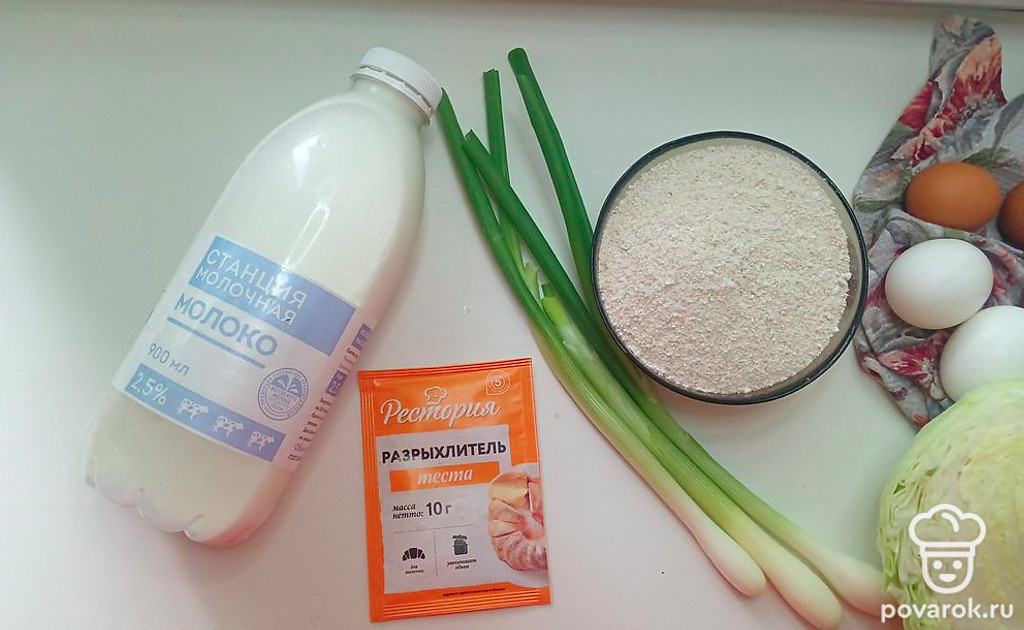Подготовьте все ингредиенты. 3 яйца залейте водой и отварите в течение 15 минут. Лук и капусту помойте и просушите. Овсяные хлопья пробейте блендером в муку. Молоко подогрейте до теплого состояния.
