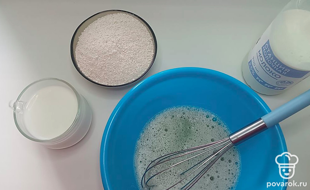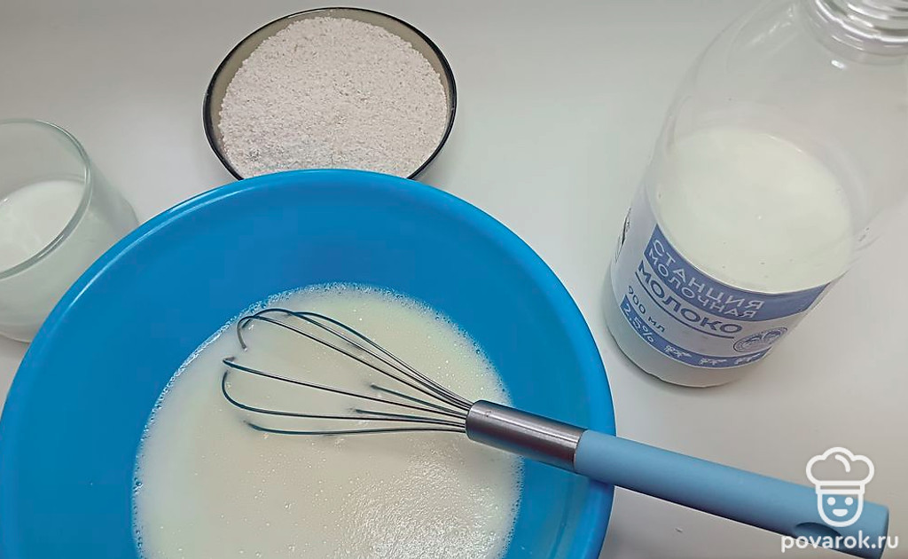 Влейте теплое молоко и, аккуратно помешивая, всыпьте муку.