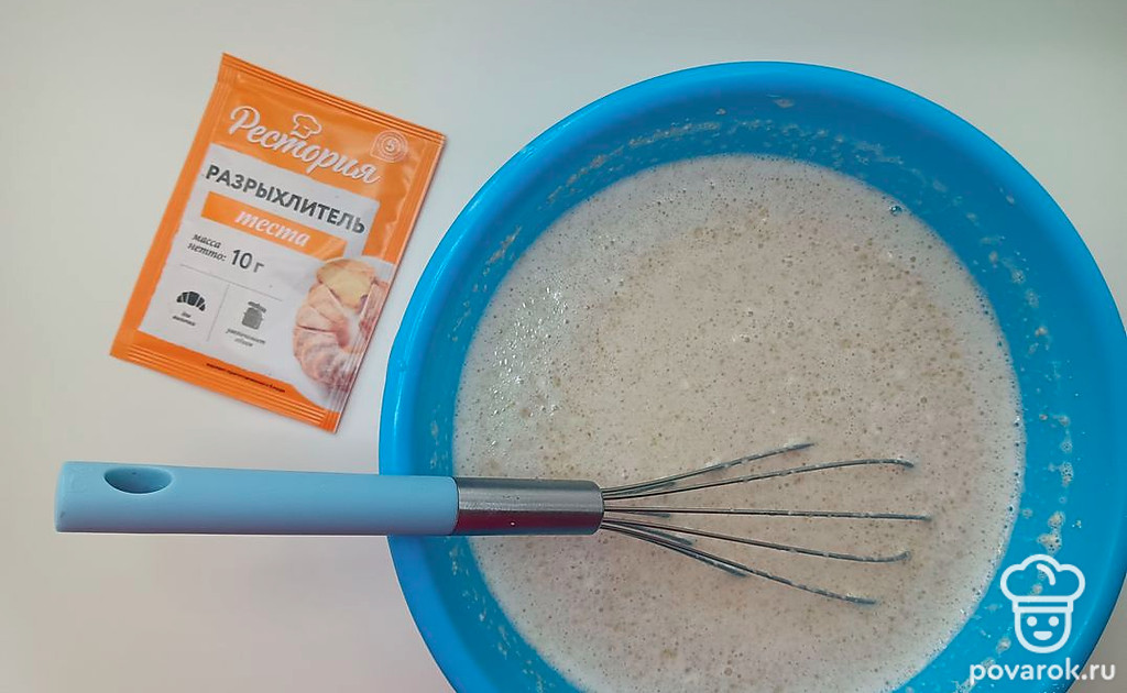 Добавьте в тесто разрыхлитель, 1 столовую ложку растительного масла и еще раз перемешайте. Дайте тесту отдохнуть 5 минут.