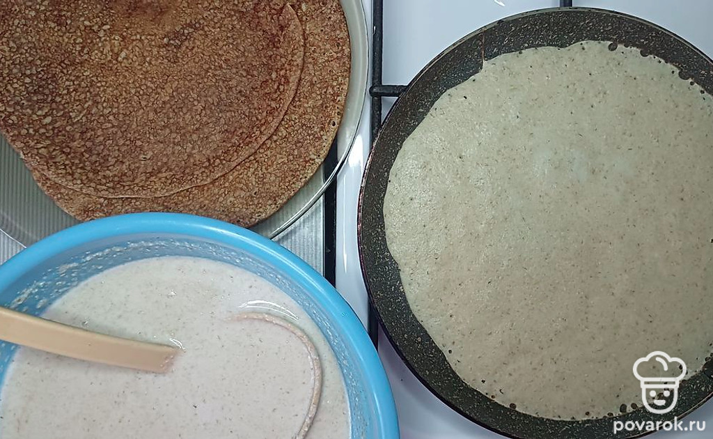 Приготовьте блинную сковороду, смажьте ее маслом для первого блина. В дальнейшем жарьте на сухой сковороде. Наливайте тесто небольшими порциями, чтобы блинчики получались тонкими, румяными и ажурными.