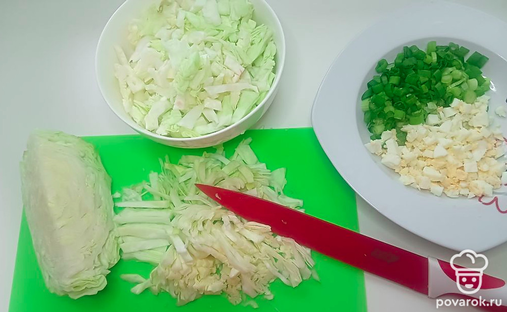 Мелко нарежьте вареные яйца и зеленый лук, отложите в сторону. Мелко нашинкуйте капусту.