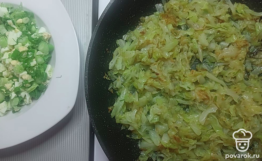 Потушите капусту в небольшом количестве растительного масла до мягкости, посолите. Затем соедините с луком и яйцом.