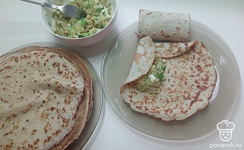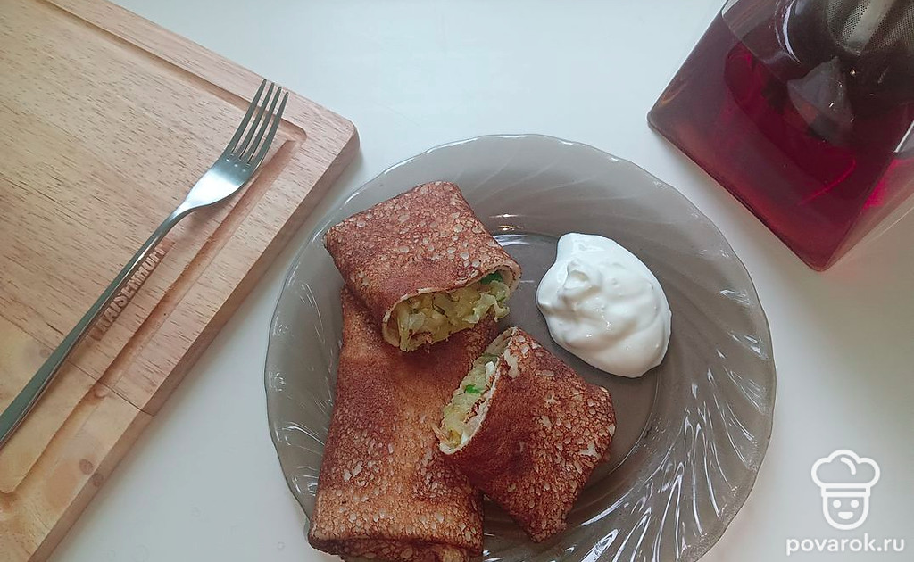 Готовые овсяные блинчики с начинкой подавайте со сметаной.