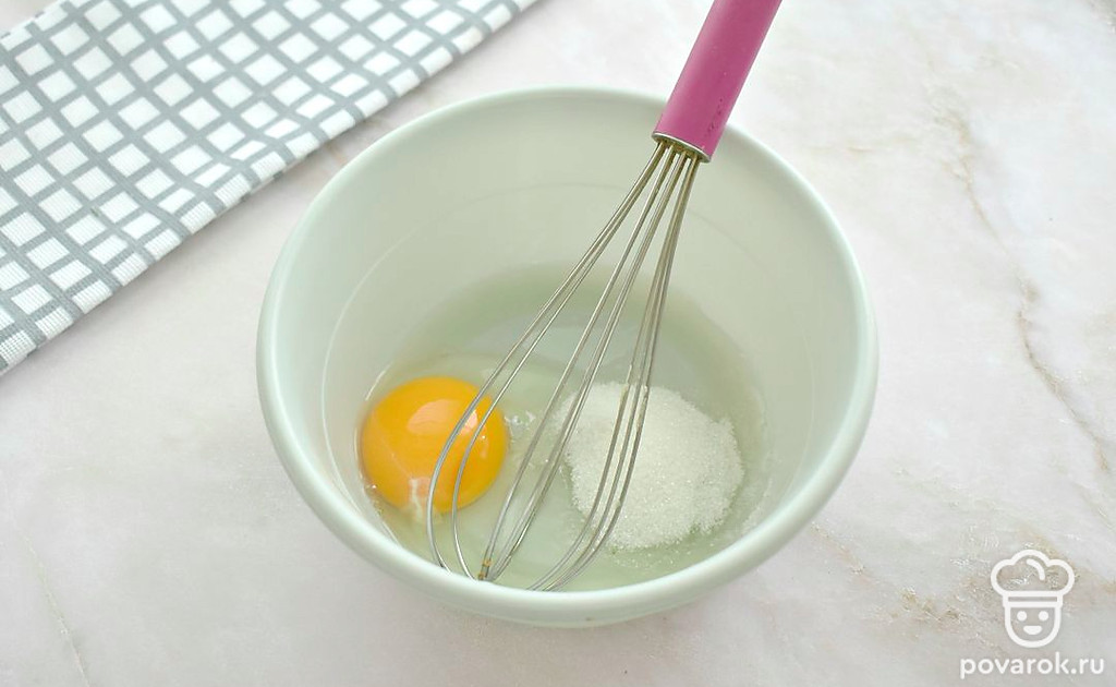 Разбейте в миску куриное яйцо. Всыпьте к яйцу столовую ложку сахара и щепотку соли. Взбейте ингредиенты венчиком.
