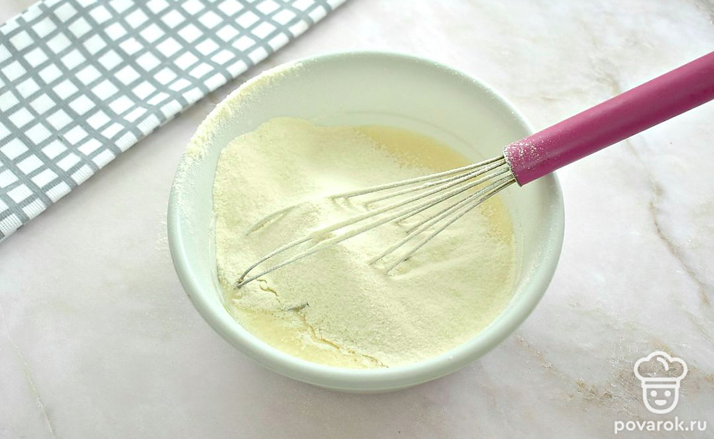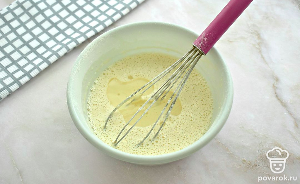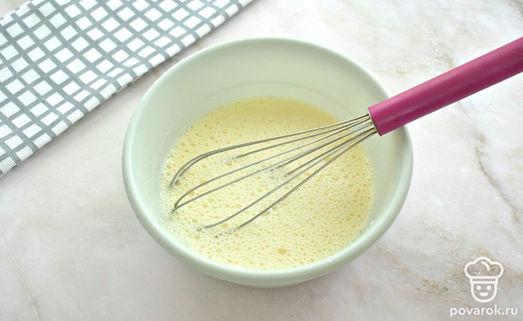 В сладкую яичную смесь влейте молоко, перемешайте.