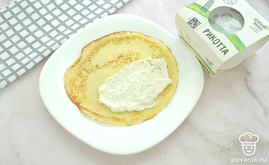 Смажьте сковороду маслом один раз и оптимально нагрейте поверхность. Жарьте тонкие блинчики примерно по 1 минуте с каждой стороны (получится 9 маленьких блинчиков). Рикотту смешайте со столовой ложкой сахара и сметаной. Начинку из рикотты выложите на половину блинчика, сверните. Начините все блины.