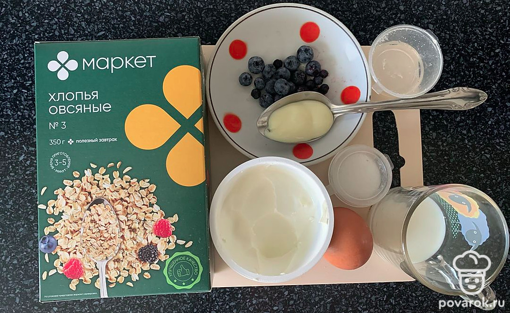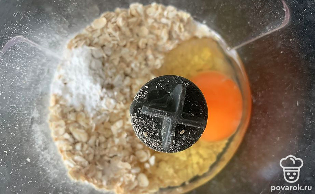 В чашу блендера всыпать овсяные хлопья, добавить яйцо, соль, разрыхлитель и молоко. Пробить до однородной массы.