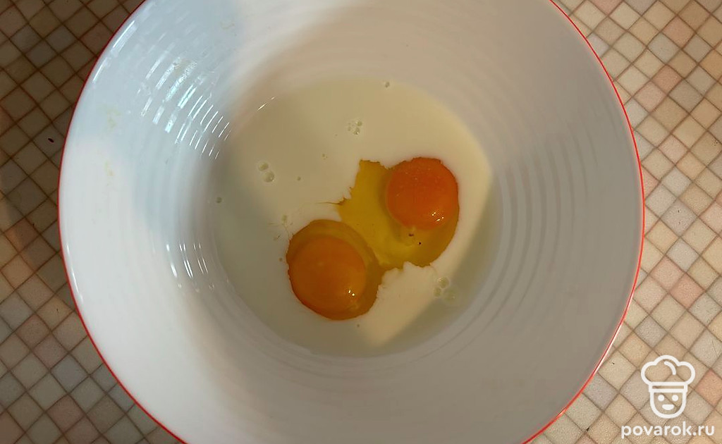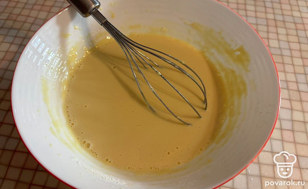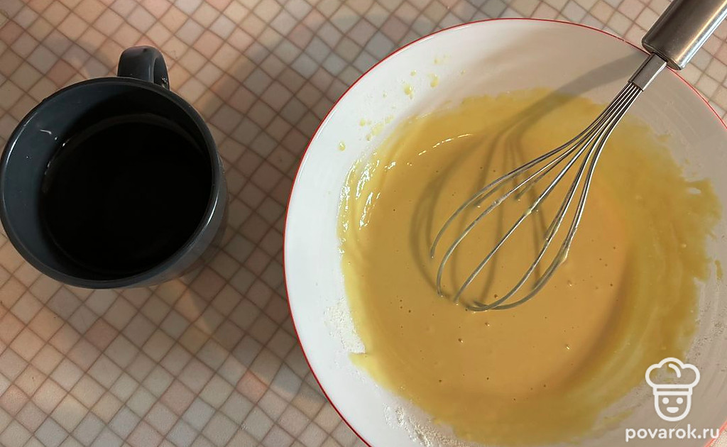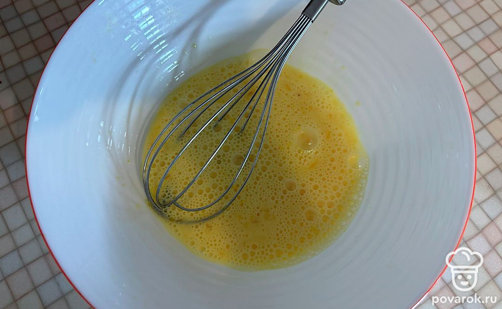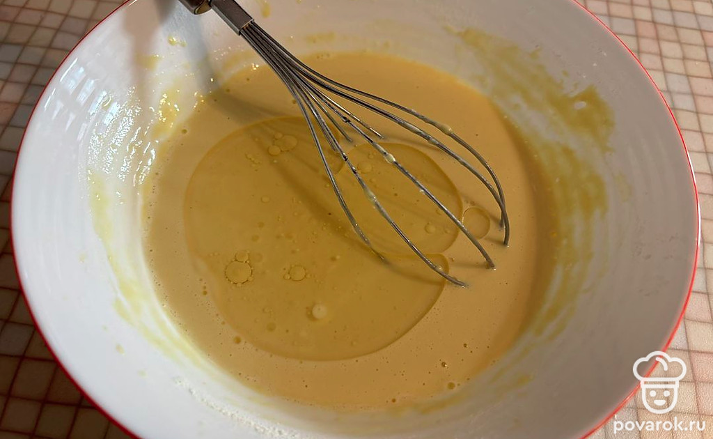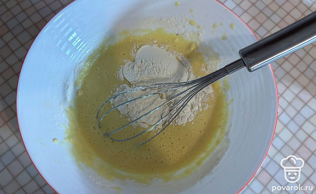 К яичной смеси просейте муку. Замешайте густое тесто.