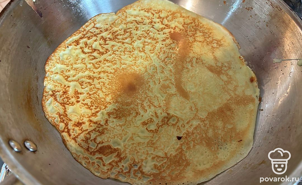 Обжарьте блины с обеих сторон, до золотистого цвета, примерно по 2-3 минуты с каждой стороны. Таким образом обжарьте все блины.