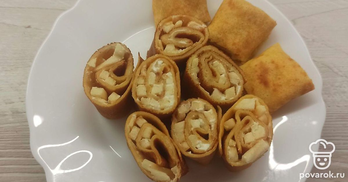 Вкусные, сладкие и ароматные блинчики с начинкой из творожного сыра и яблока.