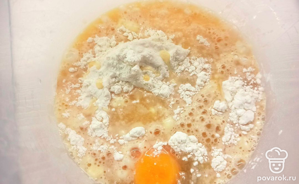 Вбейте яйцо, добавьте мультифруктовый сок и хорошо перемешайте.