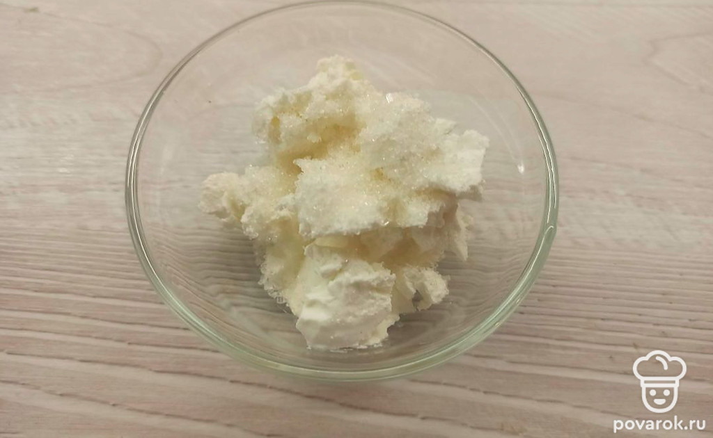 Смешайте творожный сыр с 1 столовой ложкой сахара.