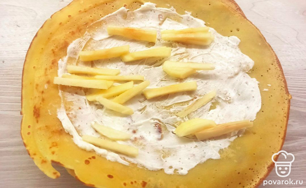 Намажьте блинчики творожным сыром и выложите яблоко.