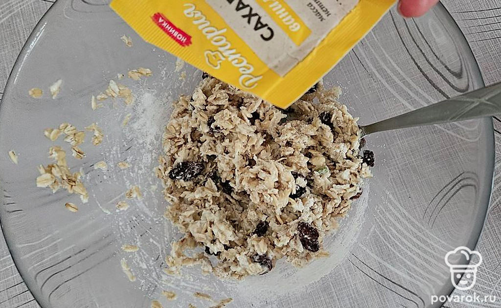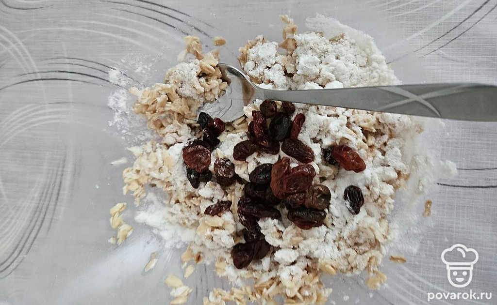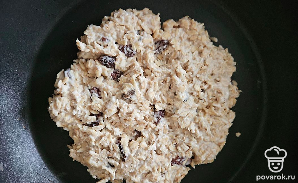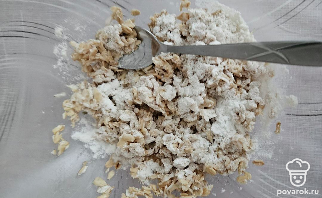 Первым делом залейте овсяные хлопья кипятком. Дайте настояться 5-7 минут. Добавьте муку и перемешайте.