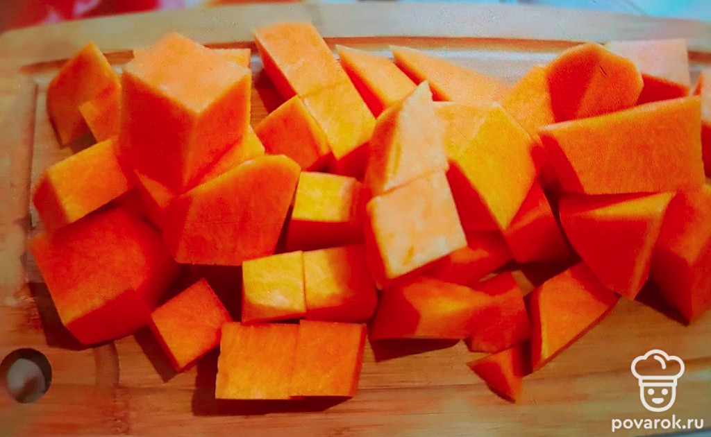 Тыкву вымойте. Срежьте кожуру, удалите семечки. Мякоть тыквы нарежьте небольшими кусками. Отварите в течение 10-15 минут до мягкости.