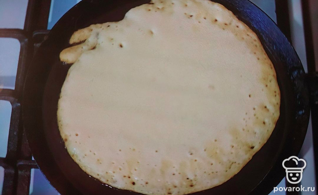 Выпекайте блины на разогретой и слегка смазанной растительным маслом сковородке. Тесто наливайте тонким слоем, равномерно распределяя.