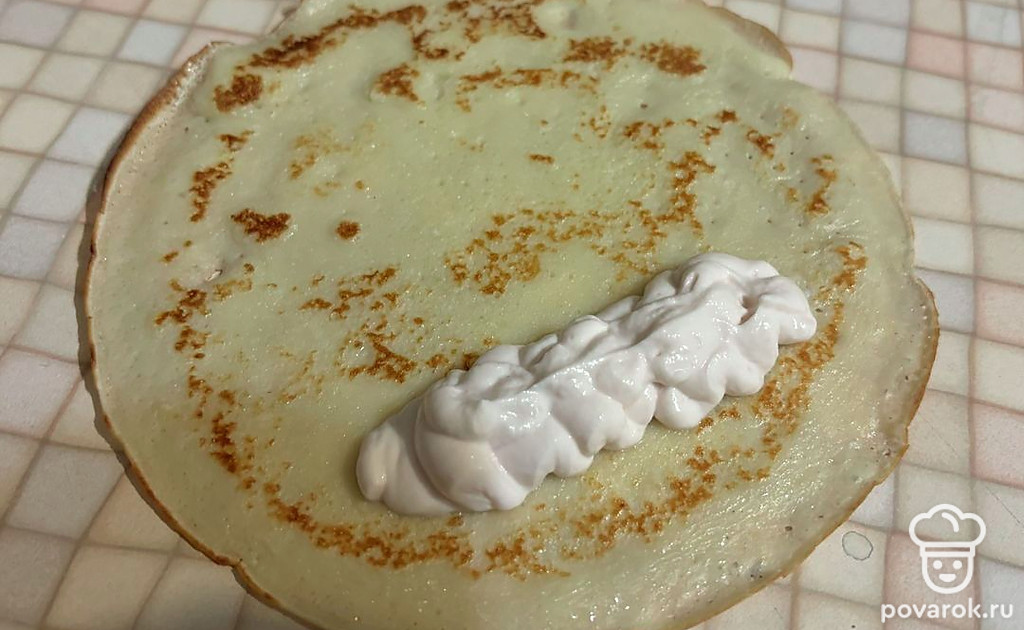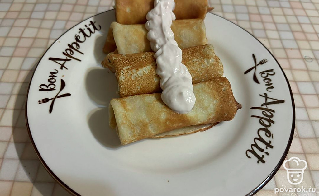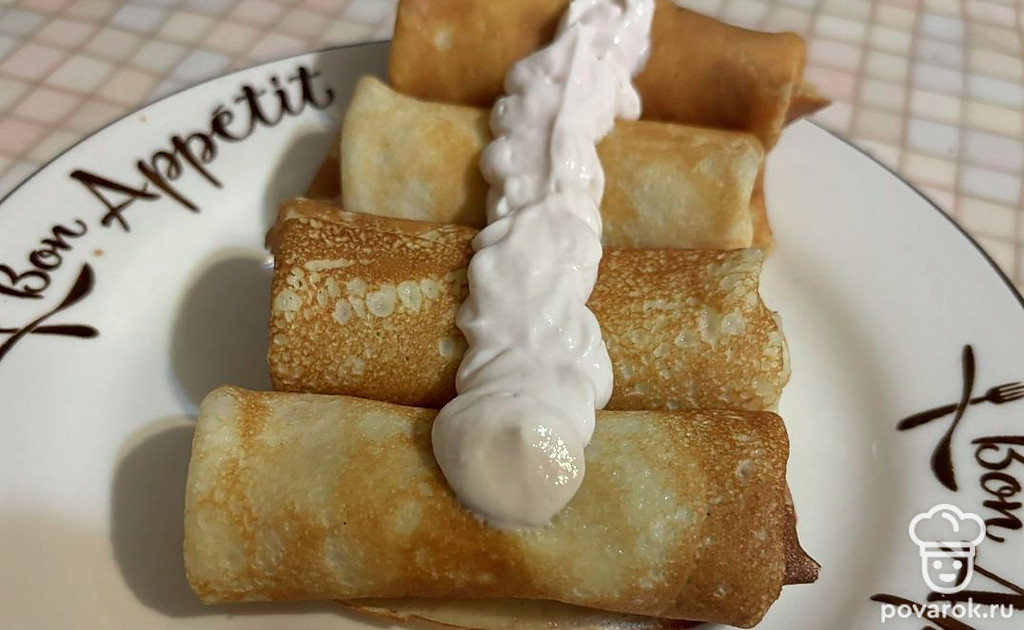 Такие блинчики можно подать в качестве десерта, дополнив их кремом.