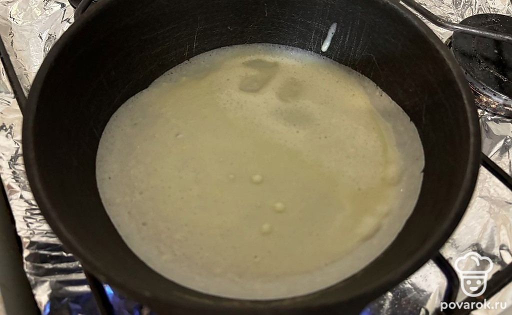 Заранее нагрейте сковороду на умеренном огне. Влейте в нее часть теста.
