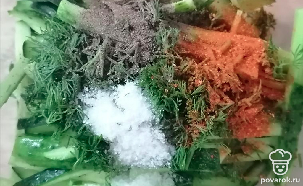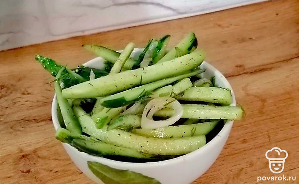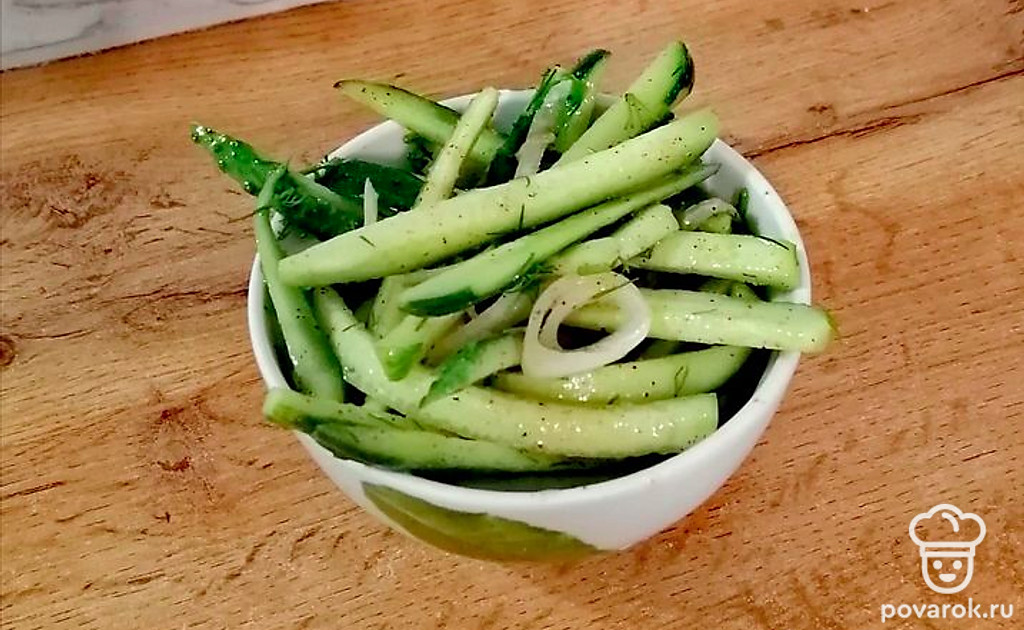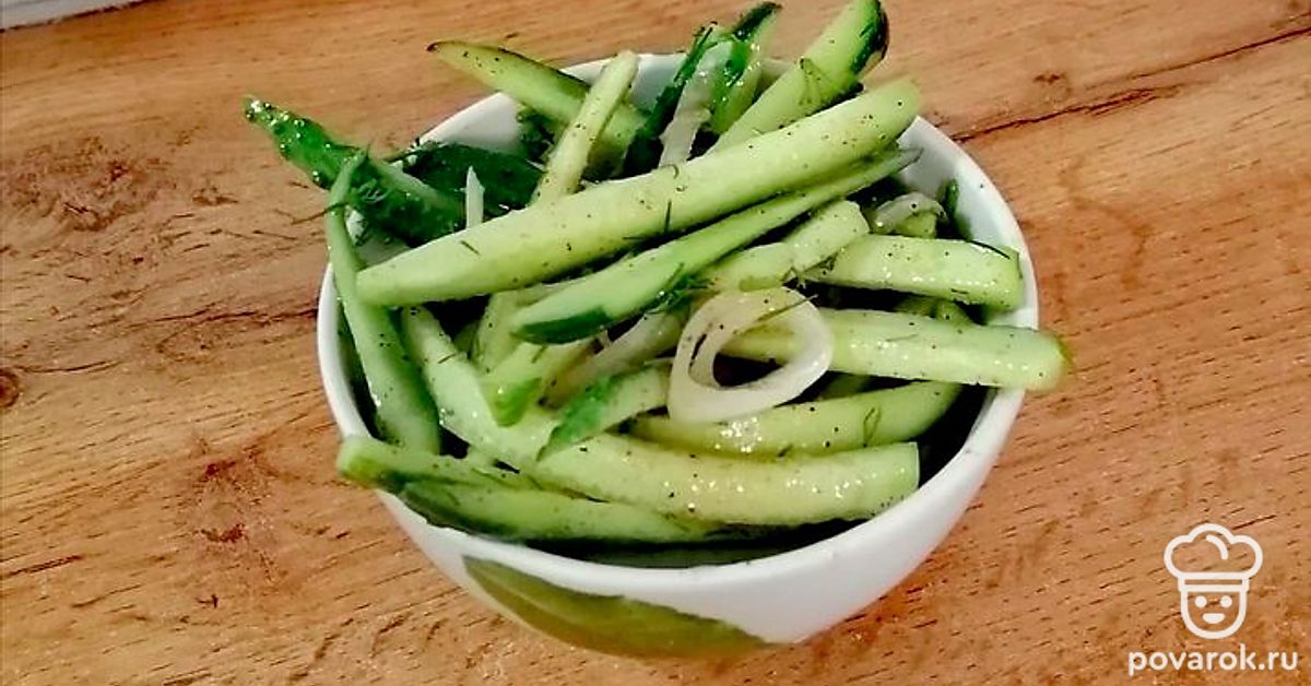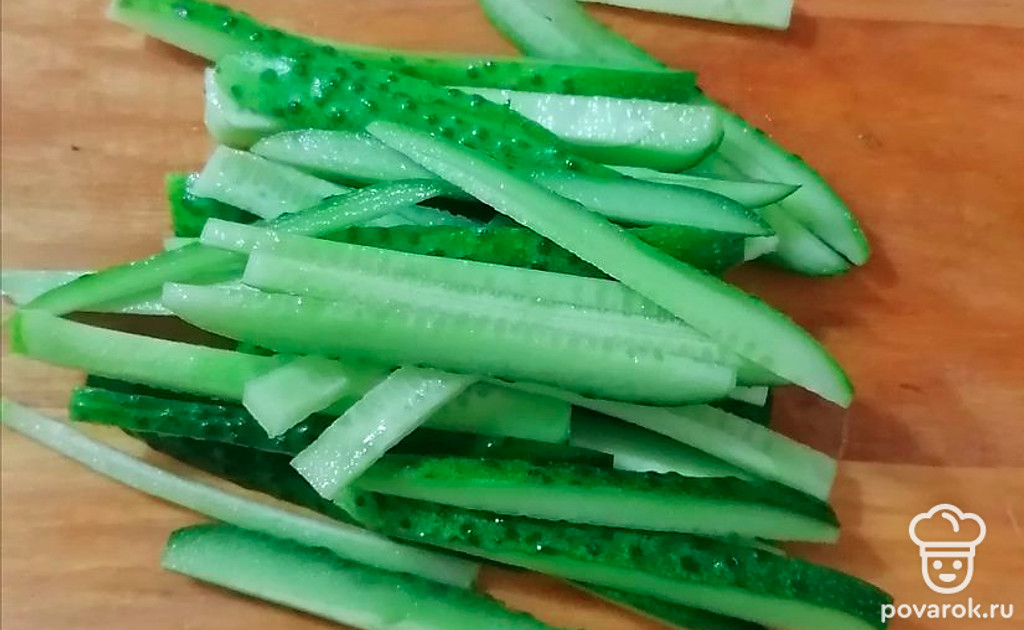 Огурцы нарежьте вдоль и потом еще раз вдоль, длинной соломкой.