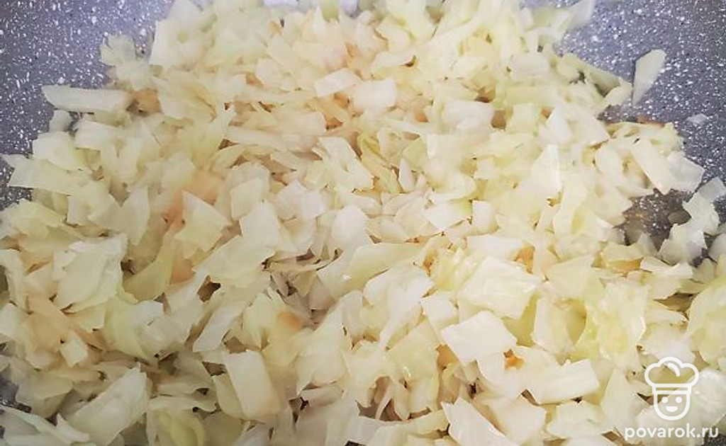 Нарежьте капусту и лук. Посолите и немного помните. Тушите на медленном огне до мягкости. При необходимости добавьте воду.