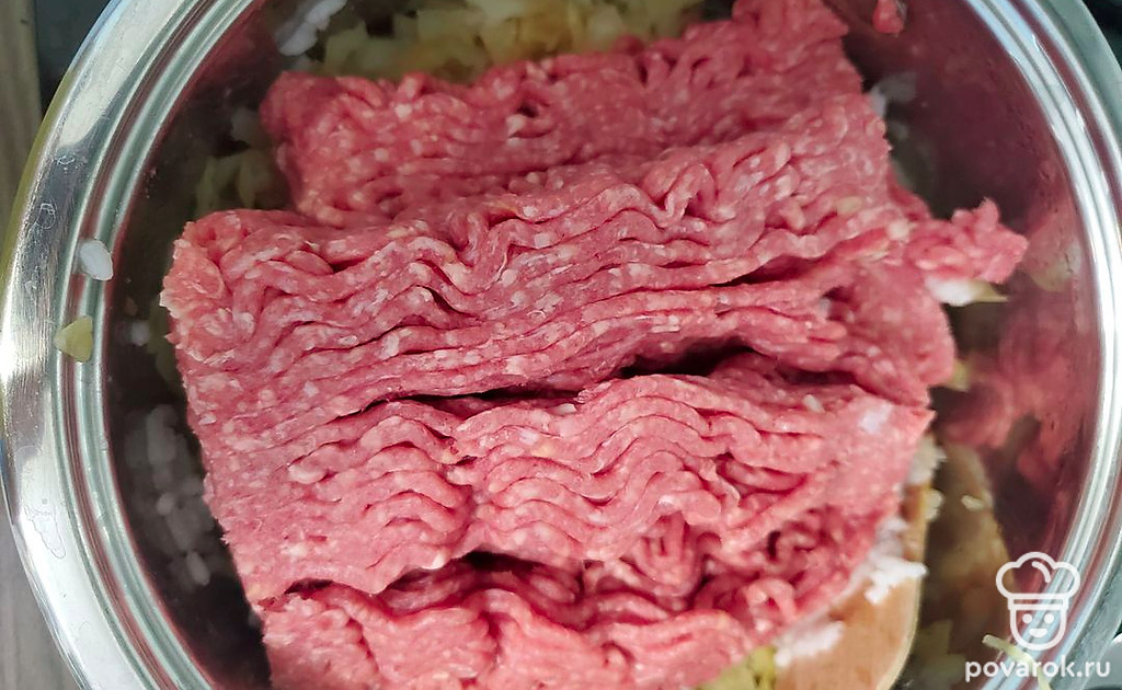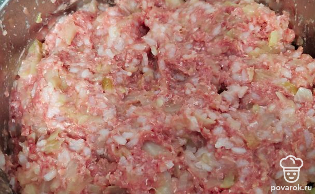 Смешайте говяжий фарш, капусту с луком и рис. Посолите.