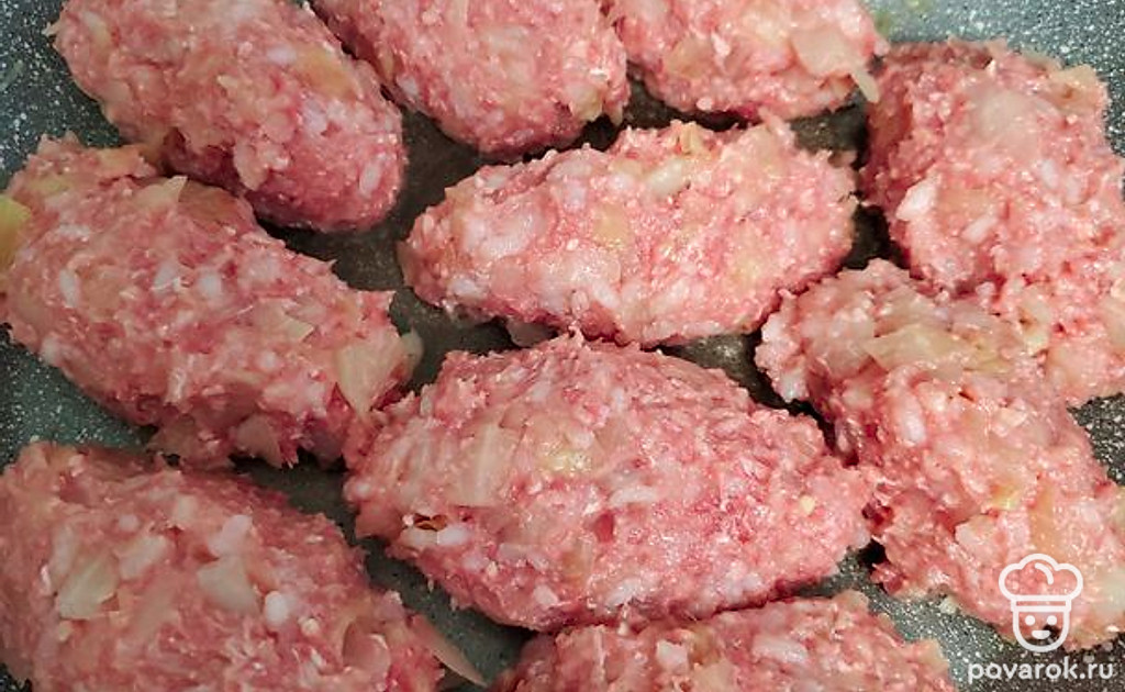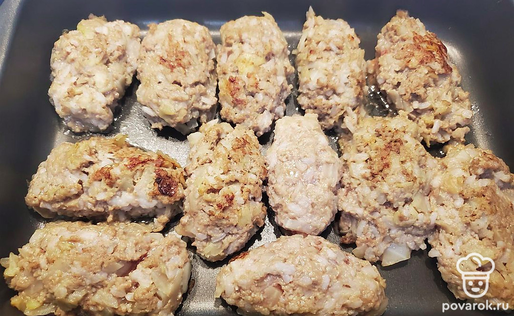 Немного обжарьте, чтобы форма не потерялась при запекания. Но этот шаг можно и пропустить. Выложите голубцы на противень.