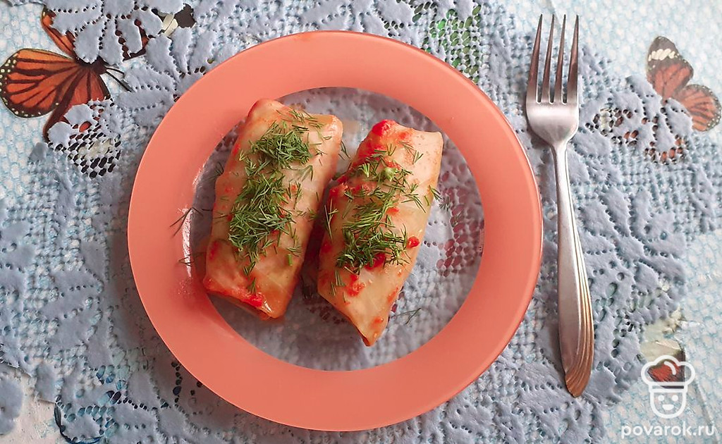 Готовое блюдо посыпьте зеленью. Можно подать со сметаной или сливочным соусом. Такие голубцы с минтаем отлично сочетаются с картошкой.