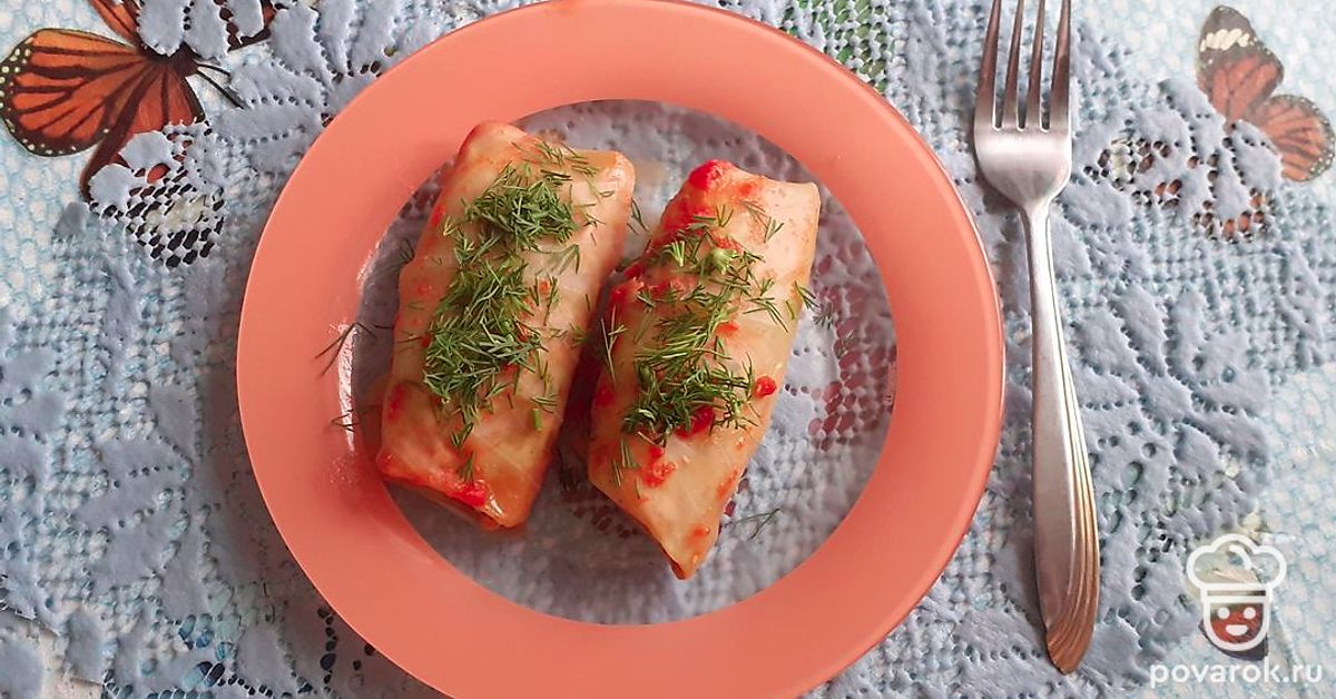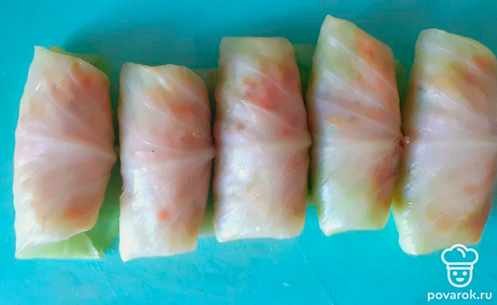 Положите начинку в капустные листы и заверните голубцы конвертиком как на фото справа.