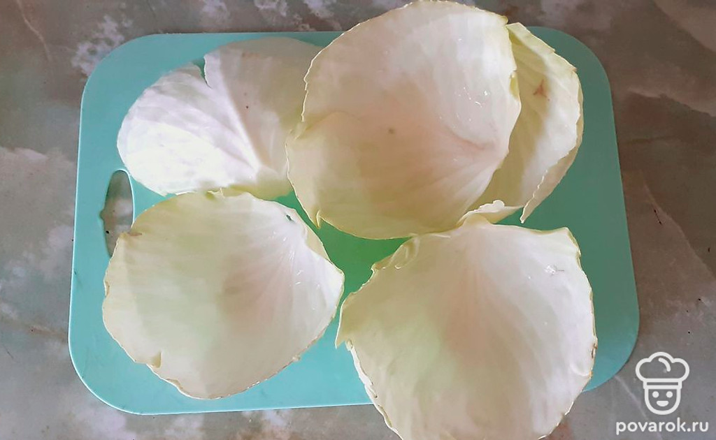 Капусту надрежьте у основания и аккуратно разделите на листочки (делать это проще под напором воды). Отварите листы в кипящей воде 2-3 минуты.