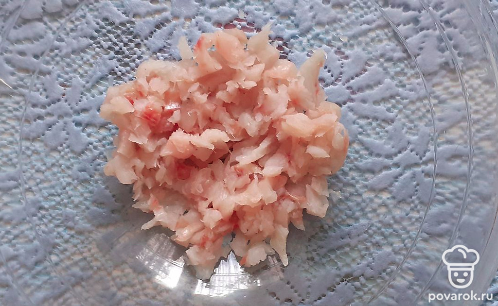 Минтай очистите от кожуры и отделите мясо от костей. Измельчите кубиками.