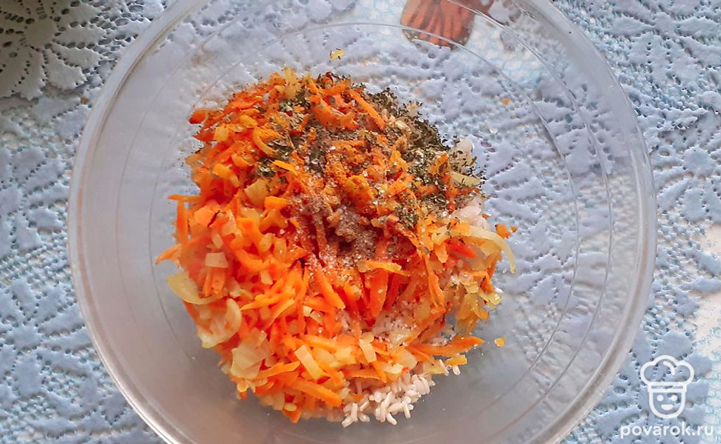 Смешайте рыбный фарш, бурый рис, зажарку из овощей. Посолите, поперчите по вкусу.