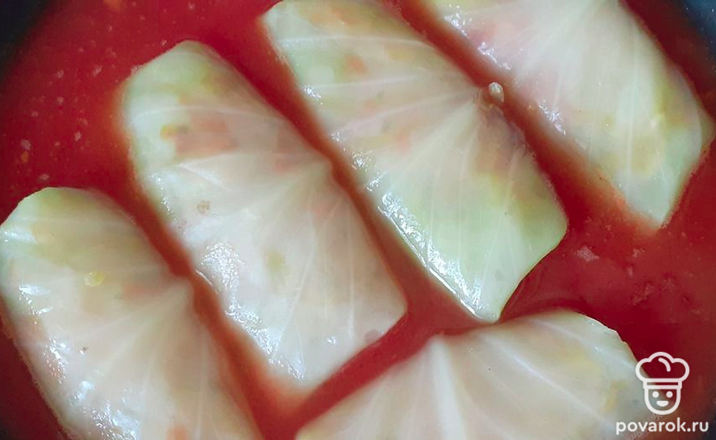 Положите голубцы в кастрюлю или сковороду. Разведите томатную пасту с кипяченой водой, посолите, поперчите. Залейте соусом голубцы, доведите до кипения. Закройте крышкой, убавьте огонь и оставьте томиться на 20 минут.