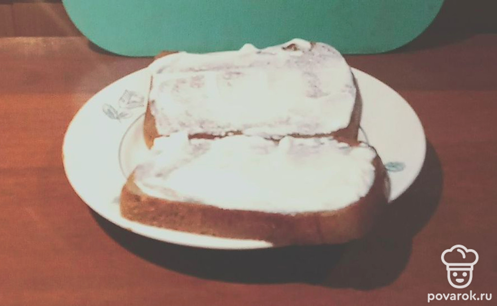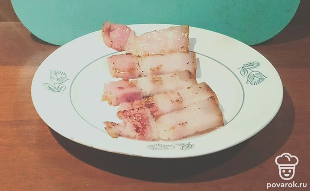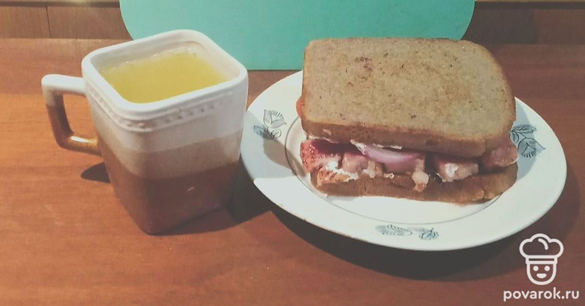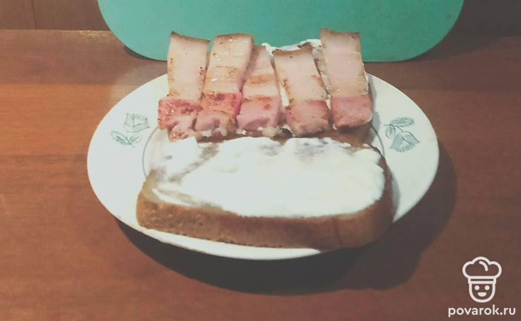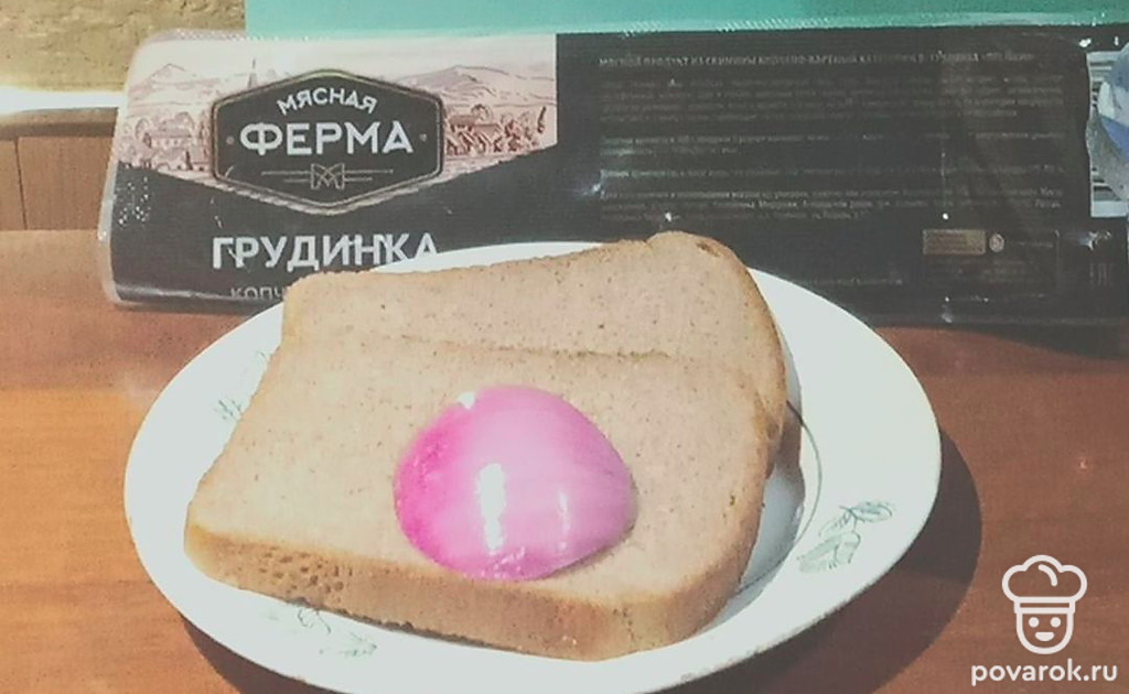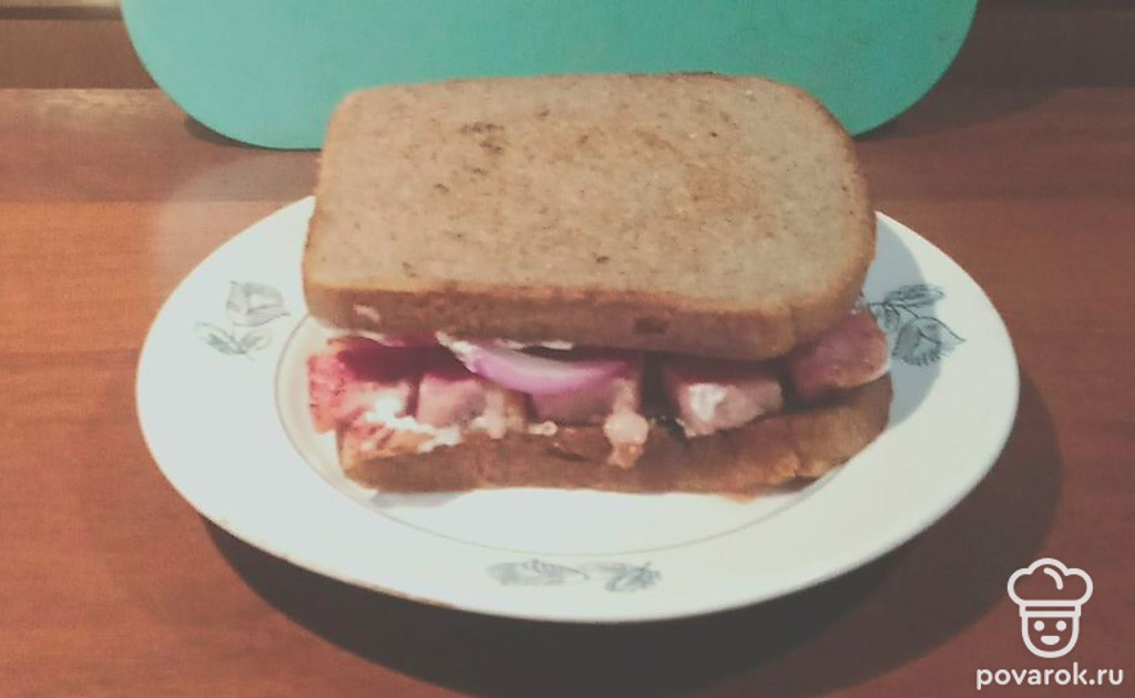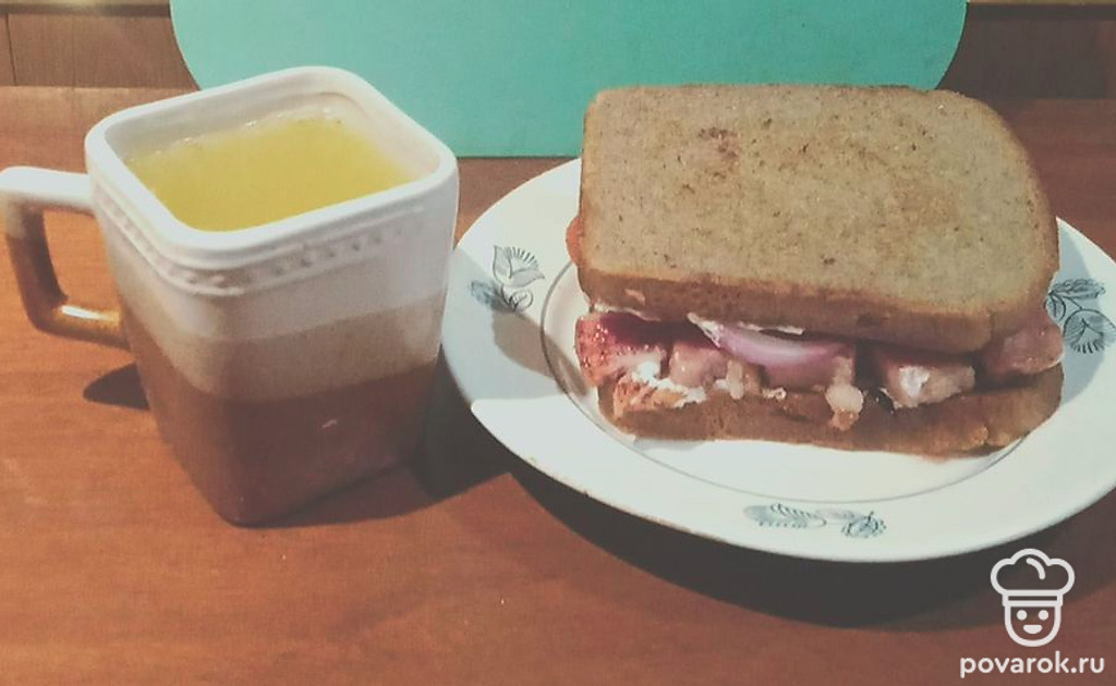 Сверху на грудинку положите лук и помидор. Закройте сэндвич второй половинкой хлеба. Блюдо готово.