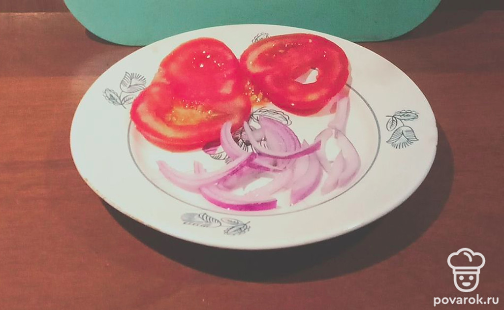 Нарежьте помидоры тонкими ломтиками, а лук — полукольцами.