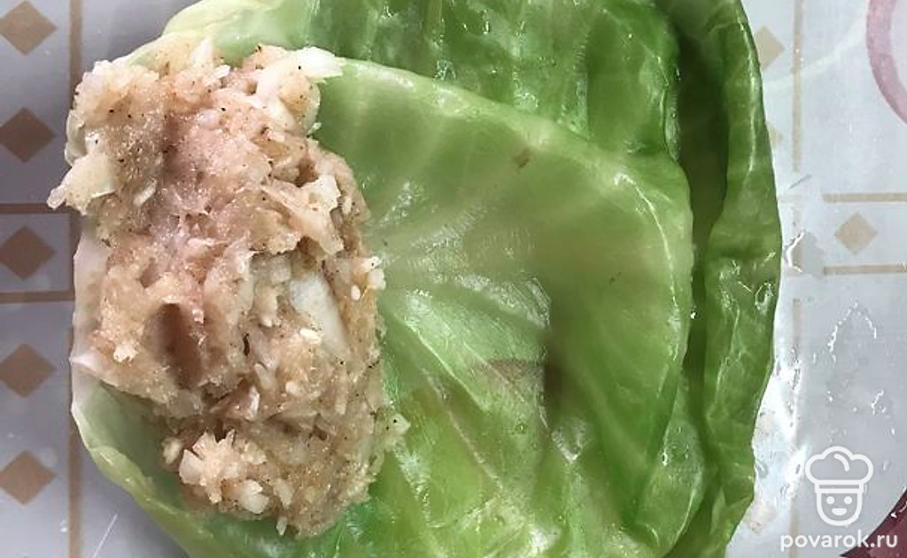 К основанию листа положите две столовые ложки фарша из порубленного куриного филе, лука и риса.