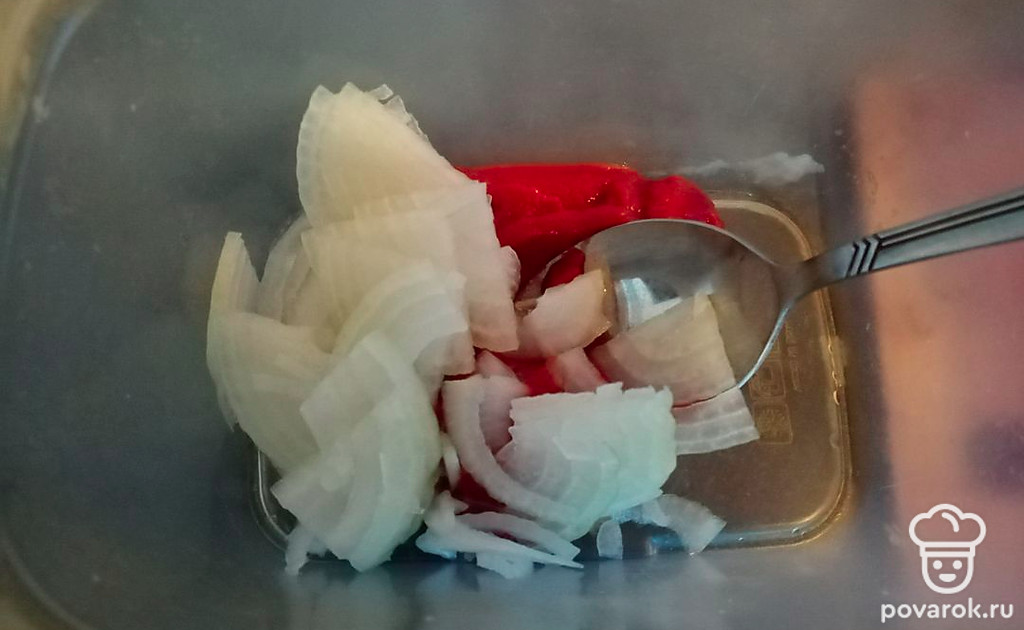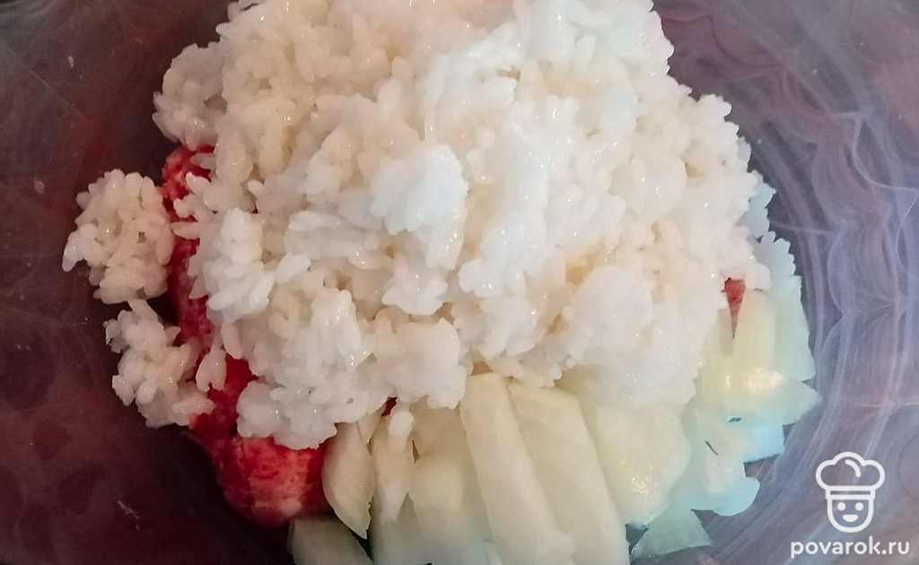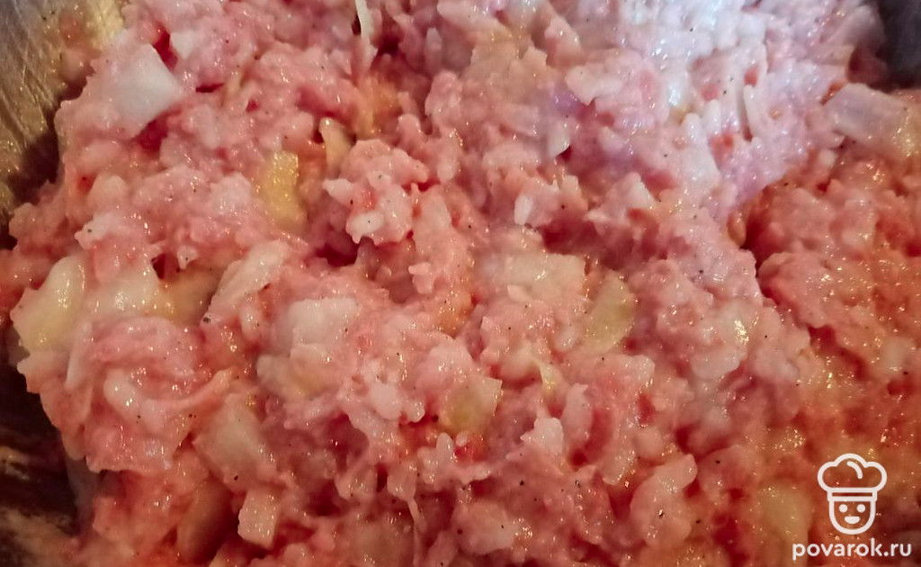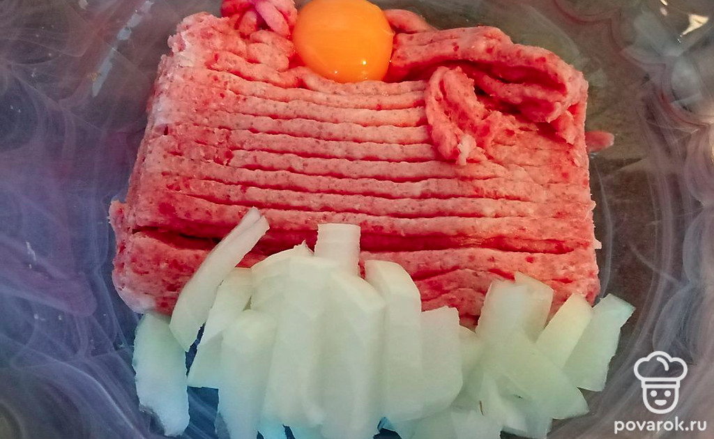 В фарш добавить яйцо и лук, мелко нарезанный.