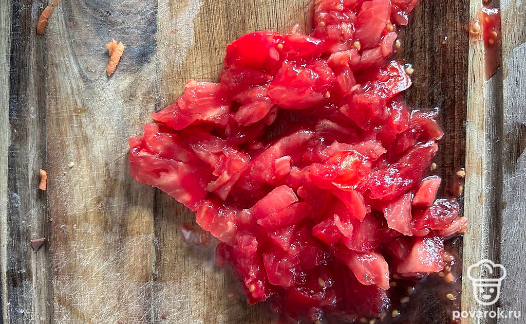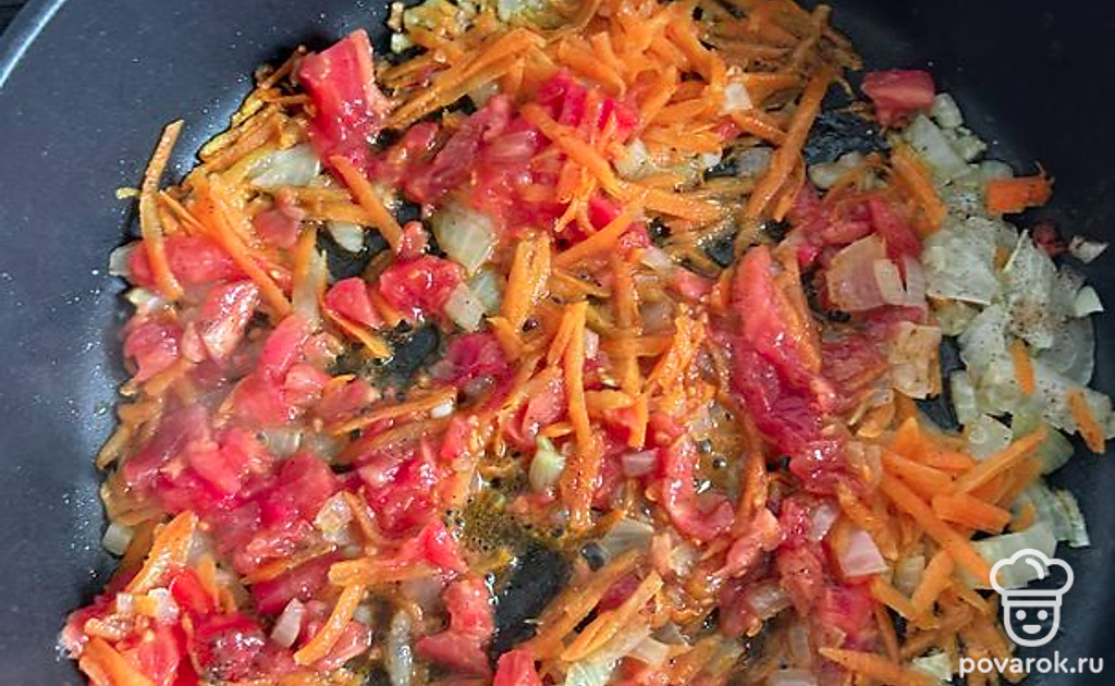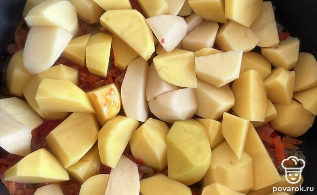 Нарезать картошку и добавить ее к овощам в сковородку.