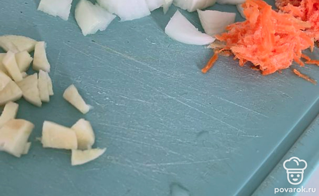 Нарезать лук и чеснок. Натереть на терке морковь.