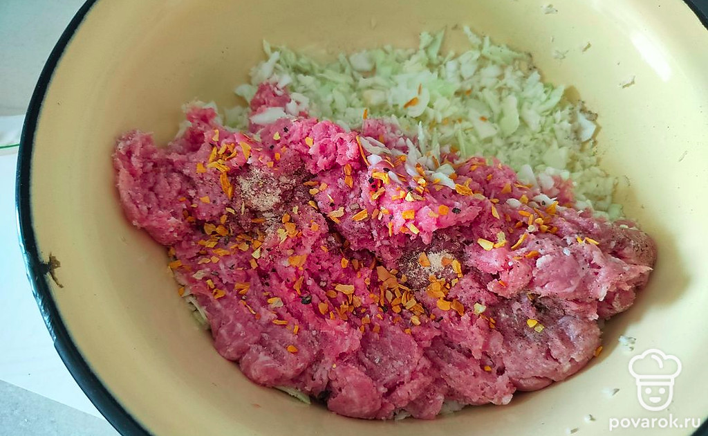 Капусту измельчить. Фарш, капусту, перец, специи, соль соединить и перемешать.