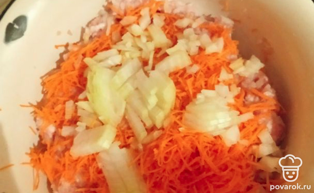 Лук и морковь кладем в фарш, перемешиваем.