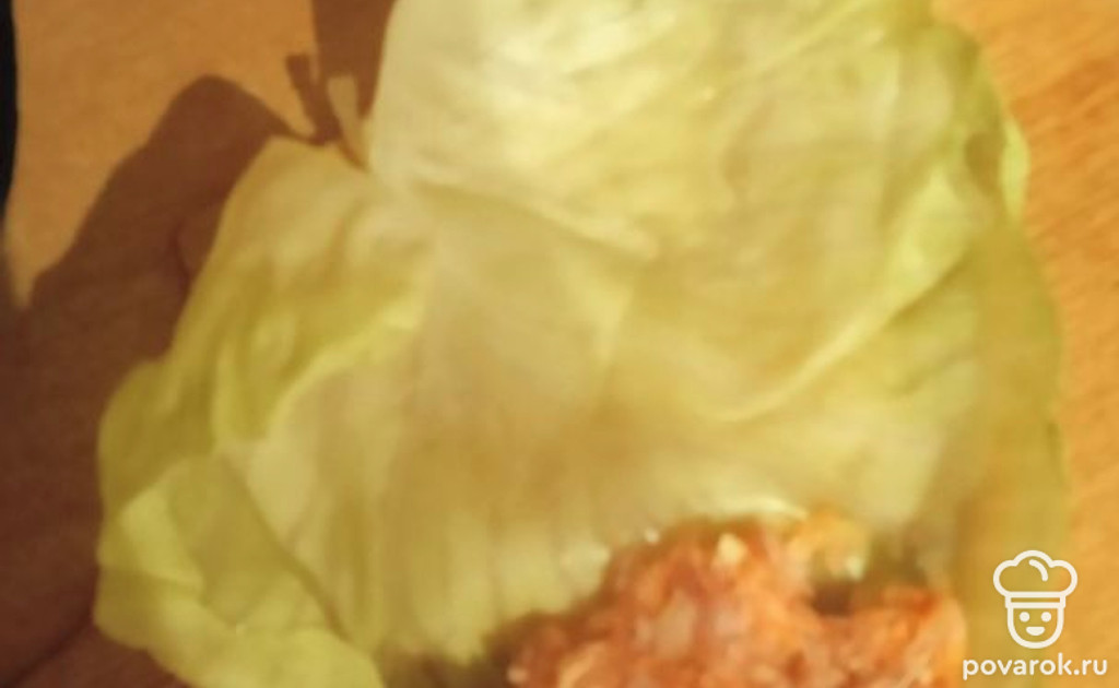 Раскрываем капустный лист, кладем в него фарш. Закручиваем.