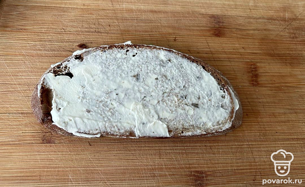 Смажьте хлеб творожным сыром.