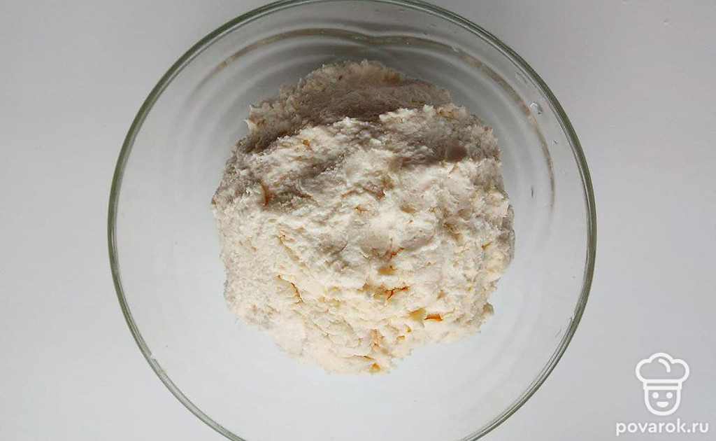 Творог размягчите вилкой, затем добавьте соль, сахар и соду. Разбейте яйцо в массу и добавьте муку. Все тщательно перемешайте и замесите тесто, а после сформируйте лепешки.