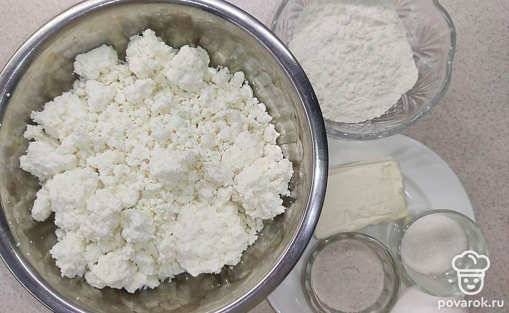 Высыпьте творог в миску, а яйцо, соль, сахар и масло разместите в тарелке. Муку высыпьте в глубокую тару.