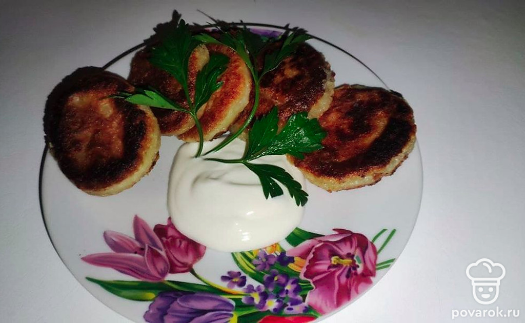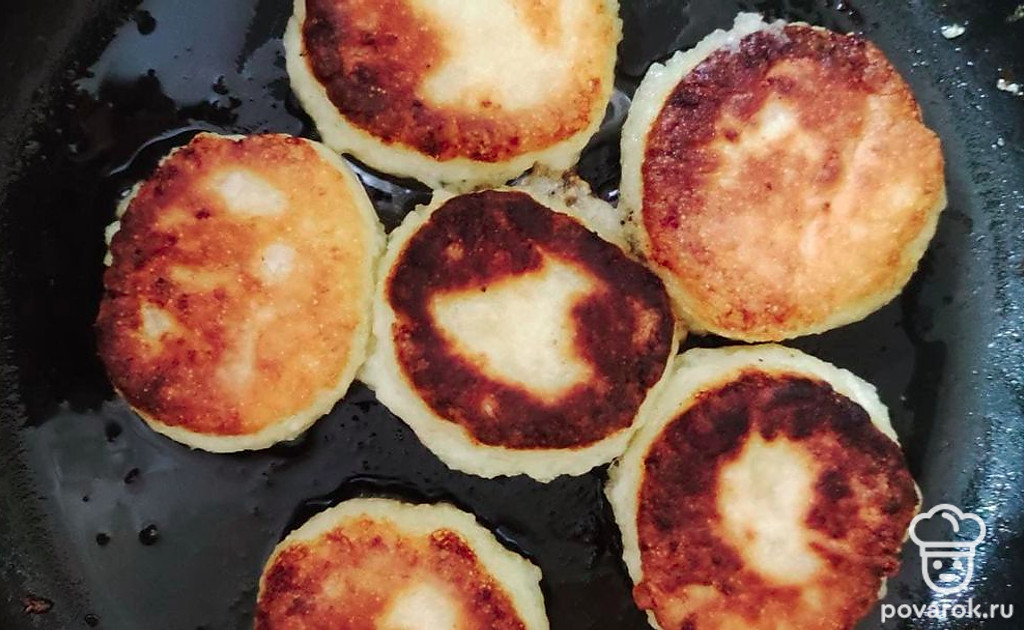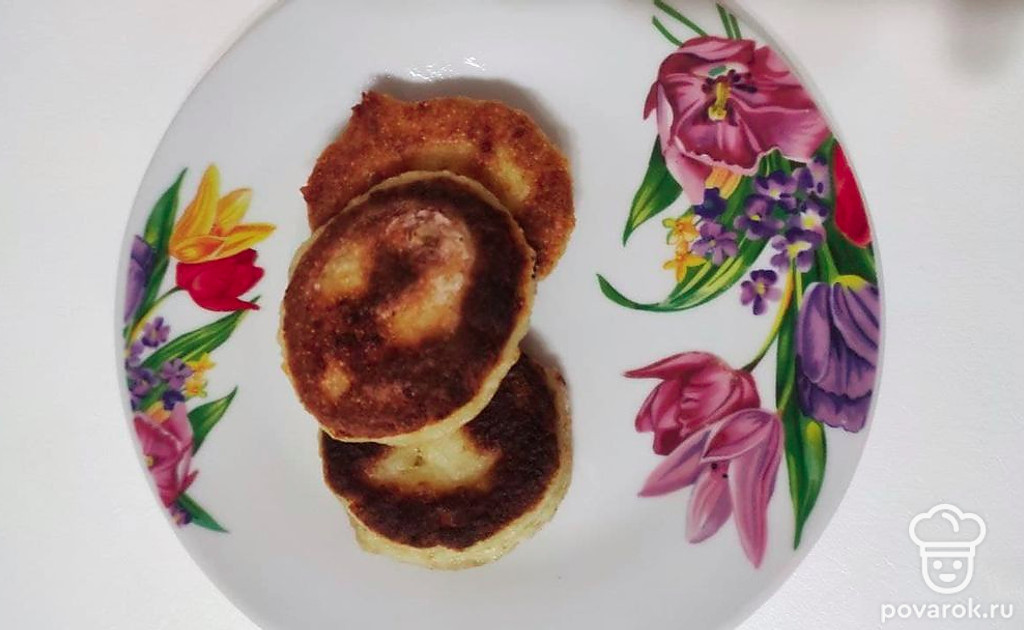 Поместите полученные сырники на сковородку. Начините их жарить на медленном огне до румяной корочки. Далее выложите сырники на тарелочку.