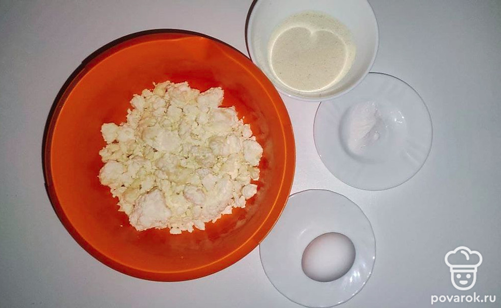 Возьмите творог и поместите в большую тару, добавьте туда же муку и манку.